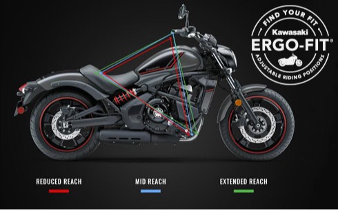 Find your fit. Unlike any other cruiser, the Vulcan S series is geared to fit a wide range of riders with its exclusive ERGO-FIT® sizing system that includes 18 possible configurations between Reduced Reach, Mid Reach, and Extended Reach set-ups.