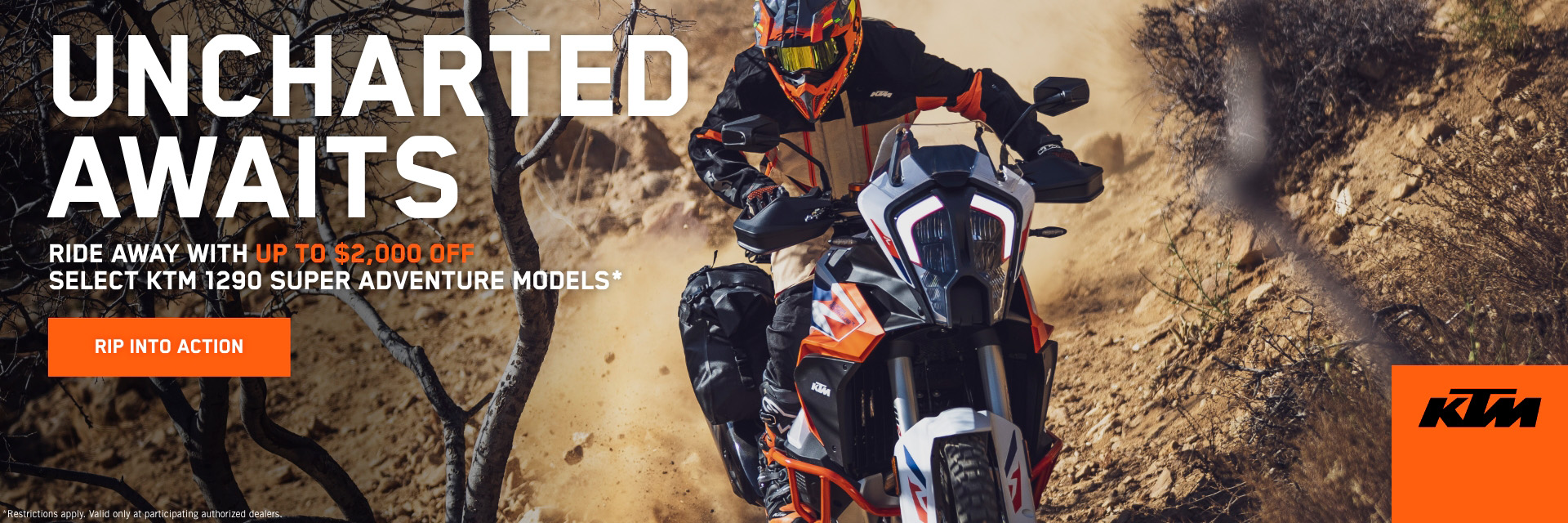 *Terms and Conditions: Offer applies to new, untitled and unregistered 2024 and 2023 KTM offroad (2024: KTM SX-E 3, 5; 50, 50 FACTORY EDITION, 65, 85 (17/14 & 19/16), 125, 250, 300 SX; 250, 350, 450, 450 FACTORY EDITION SX-F; 125, 300 XC; 250, 350, 450 XC-F; 150, 250 XC-W; 450 XCF-W; 350, 500 EXC-F; 500 EXC-F SIX DAYS) and street (2024: KTM 450 SMR; RC 390; 250, 390, 790, 990 DUKE; 1290 SUPER DUKE GT; 690 SMC R; 890 SMT; 690 ENDURO R; 390 ADVENTURE; 890 ADVENTURE R; 1290 SUPER ADVENTURE R; 1290 SUPER ADVENTURE S / 2023: KTM 200 DUKE) model motorcycles. Financing offer available through Santander Consumer Bank “Santander”. Where no money down is indicated, it is available only to those well-qualified applicants with approved credit. Annual Percentage Rates (APR) of 0.99% for up to 60 months, and no down payment offers available to qualified applicants only. Santander requires a minimum financing amount of $1,500. Not all buyers will qualify and if approved may receive a higher rate and higher payment, depending on credit score. Some buyers will require a higher down payment in order to receive credit approval. Other charges may apply. Subject to model availability and dealer participation. Subject to credit approval by Santander, not all applicants will qualify. Santander maintains the right to charge back all costs of financing should a retail promotion and a financing offer be selected when the 2 cannot be combined (as defined in the retail program). Financing offer can change or be cancelled at any time. Offer valid October 20, 2025, through December 31, 2025. This offer cannot be combined with any other offers. Finance offer valid through authorized KTM dealers only. See local authorized dealer for details.